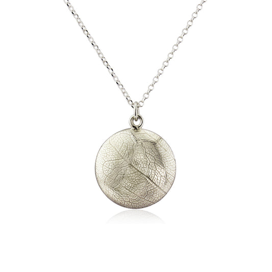 Domed circle necklace reversible leaf skeleton textured - small
