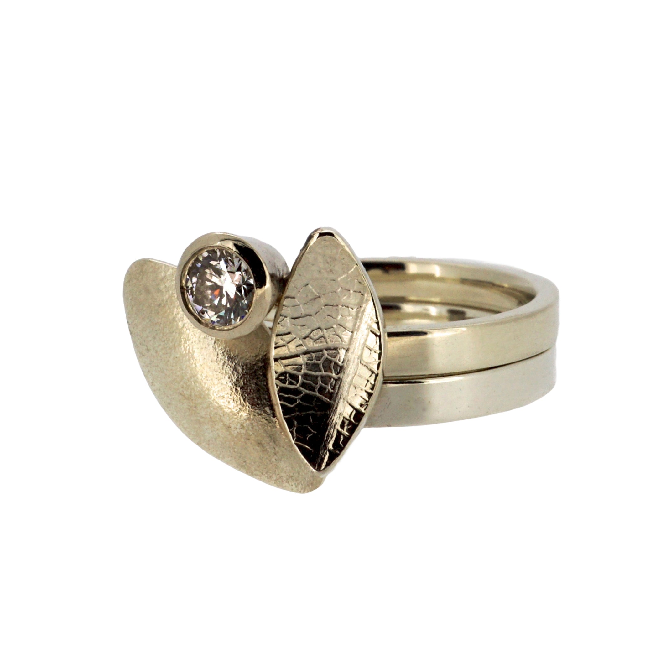 9 carat white gold and diamond leaf duo engagement and wedding rings.