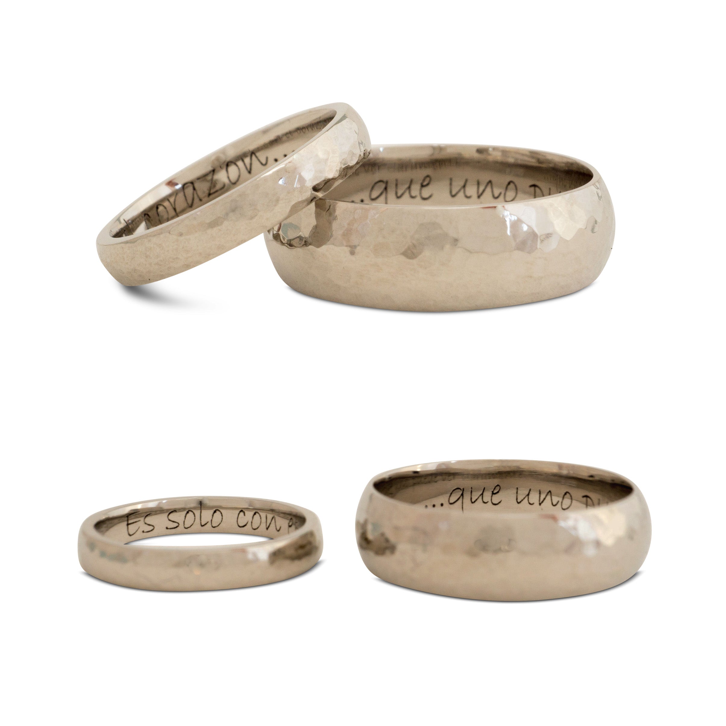 Hammered, polished, palladium wedding rings with laser engraved messages on the inside.