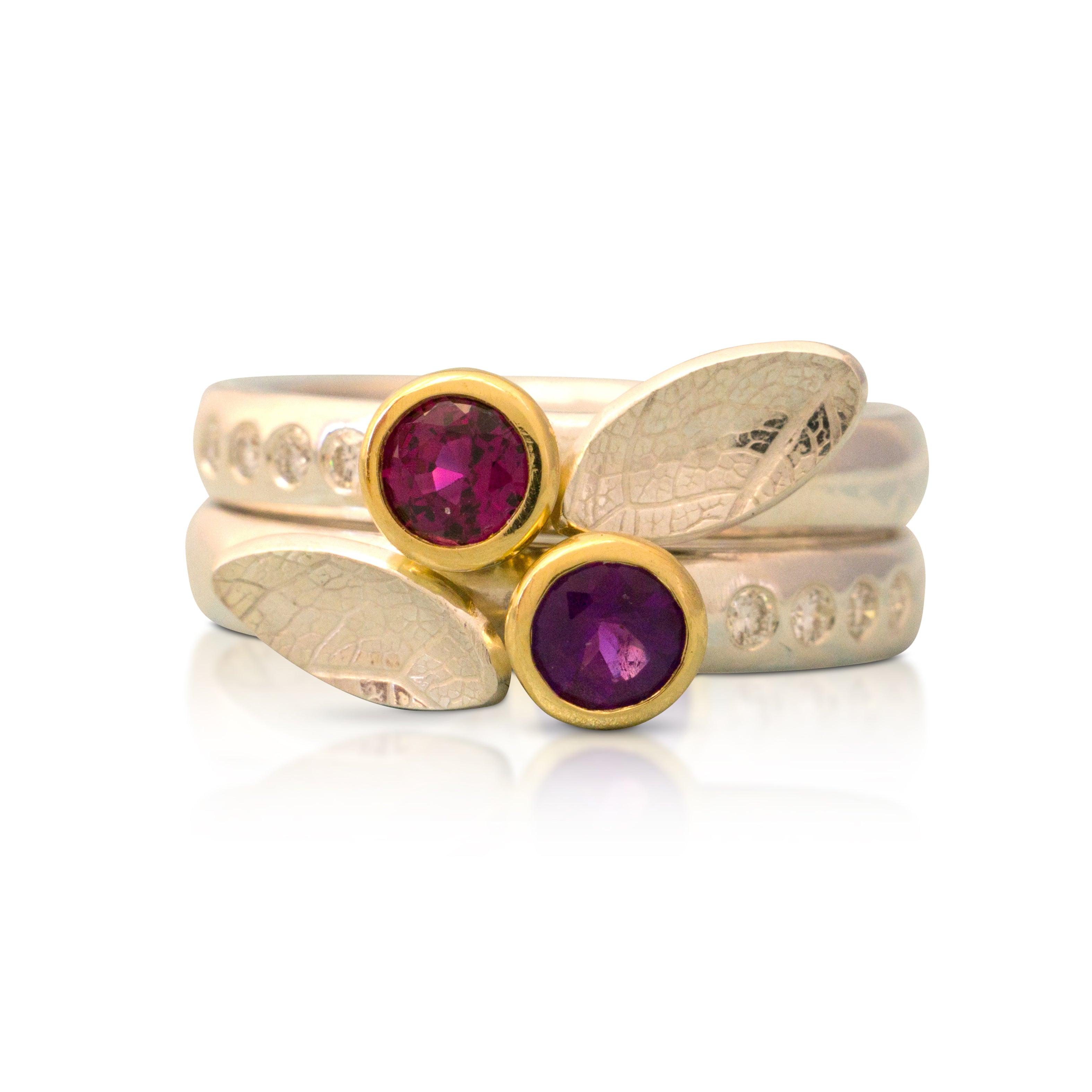 This pair of rings were a very special commission to signify a couple's family. I set their two daughters' birthstones (ruby and amethyst) in 18 carat yellow gold, with 4 diamonds flush set into both of the silver ring bands. The silver leaf skeleton embossed leaf shapes are symbolic of the initials of their family's first names: L, E, A and F.