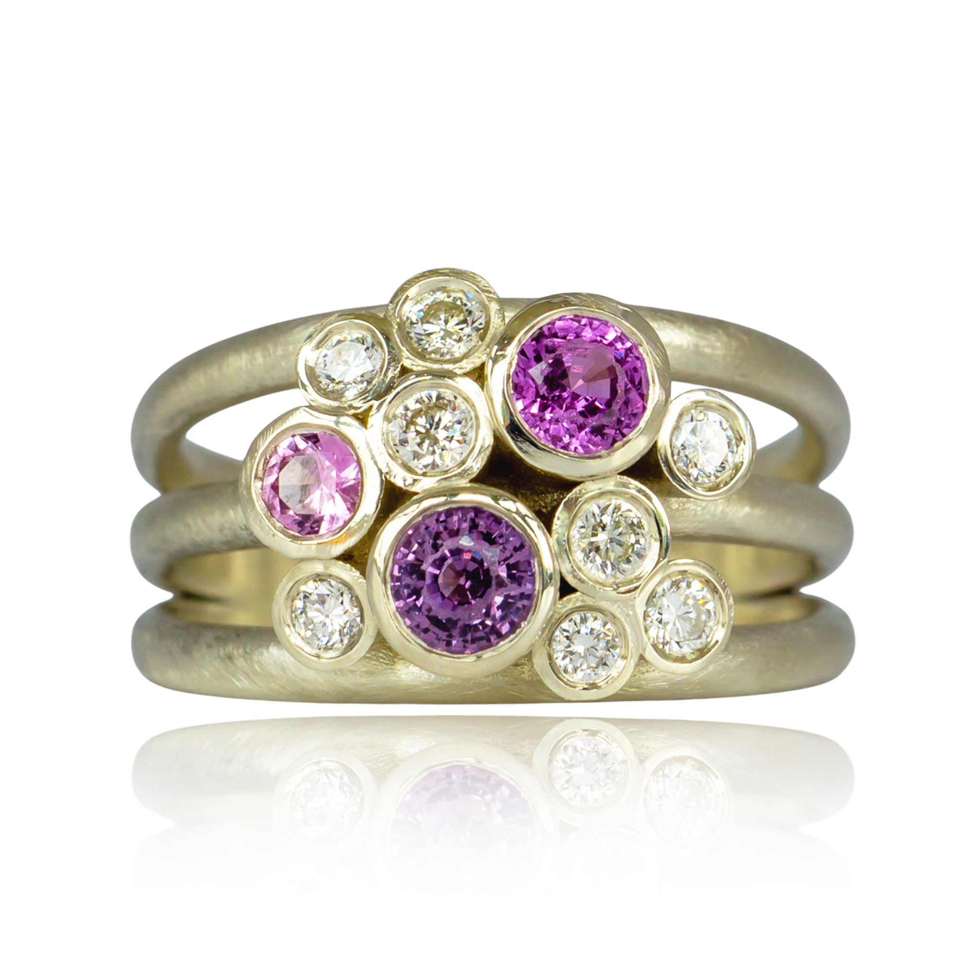 9 carat white gold, pink sapphire and diamond remodelled eternity ring with polished settings and satin finish joined ring bands.