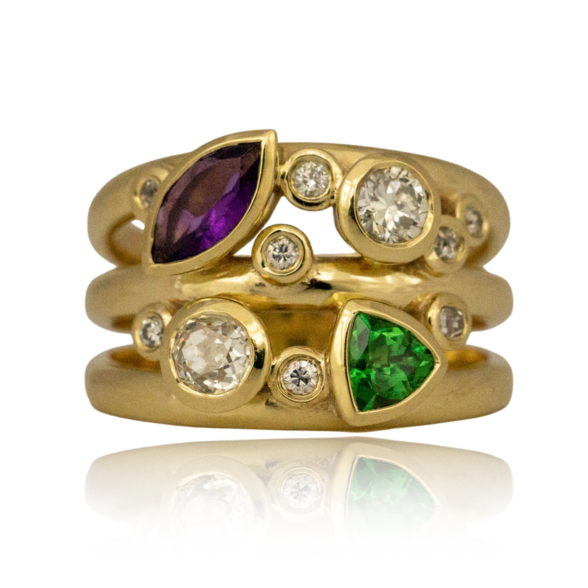 Wedding/eternity ring with inherited, heirloom diamonds, amethyst and tsavorite garnet set in 9 carat yellow gold.