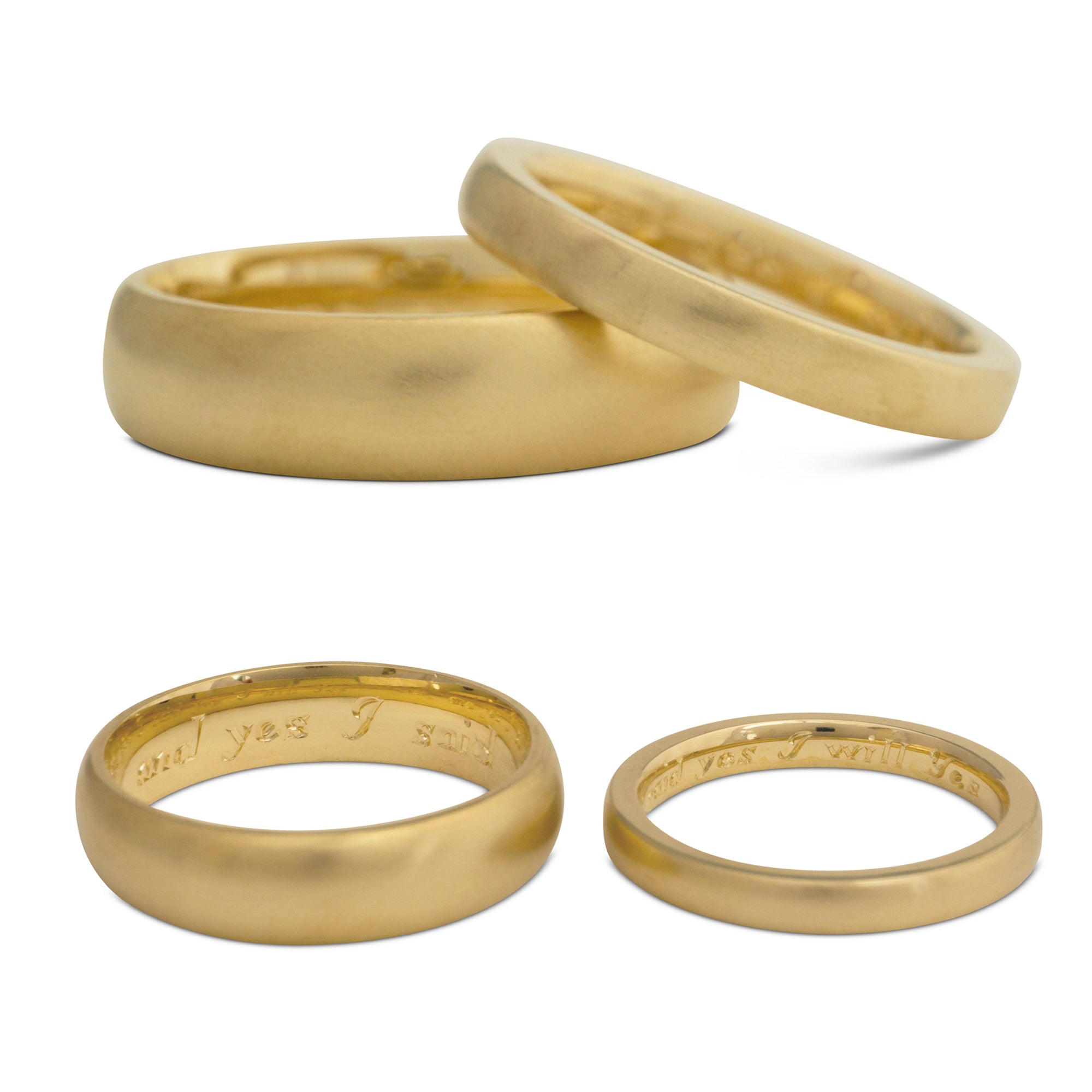 9 carat yellow gold court shaped wedding bands. Polished, hand engraved inside and satin finish outside.