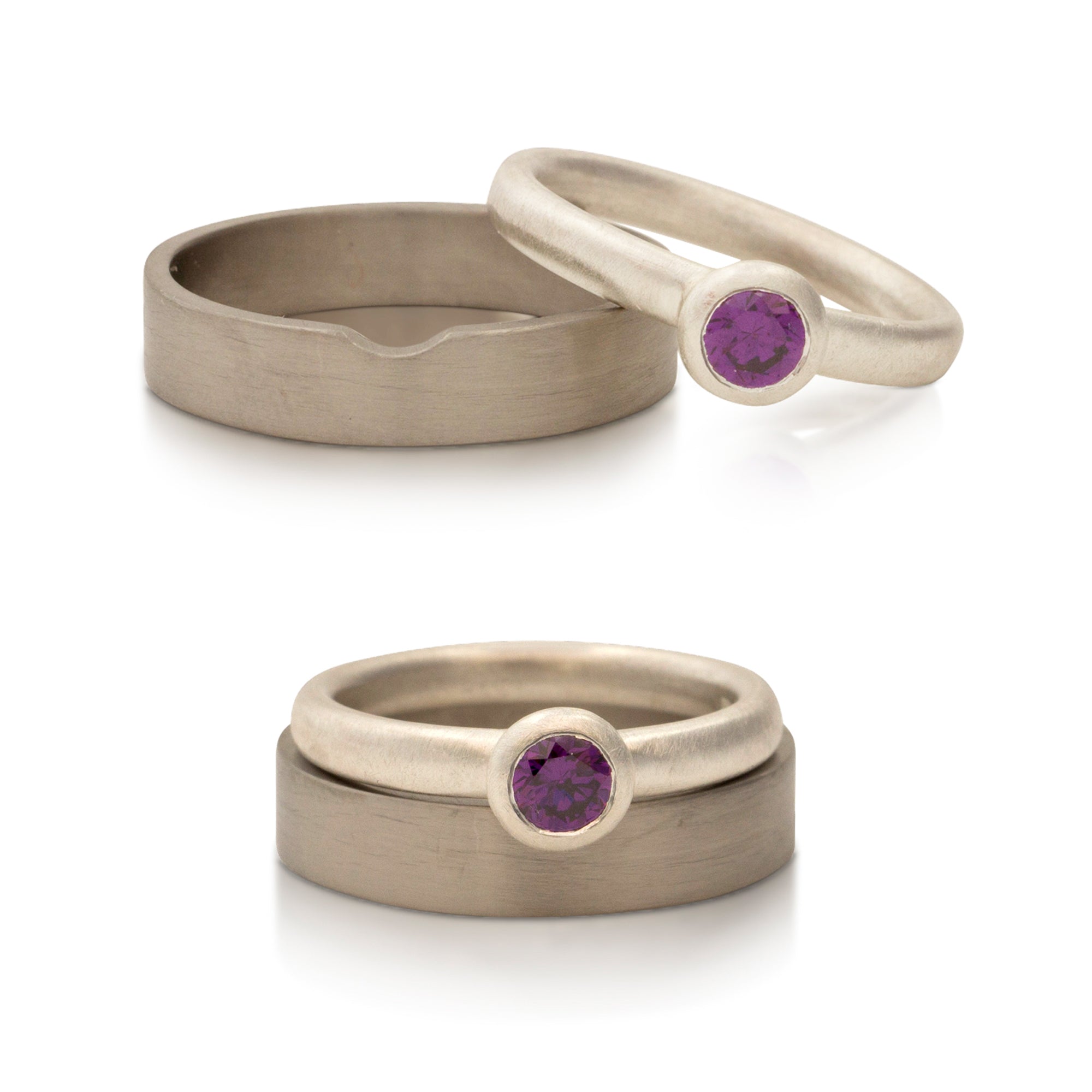 I made a pair of wedding rings for a couple who had a great idea of their wedding rings fitting together when stacked together. I love the symbolism of the two rings fitting together, but being worn separately. Left/bottom: Palladium rectangular cross section, satin finish ring. Right/top: Silver court shaped ring band with amethyst.