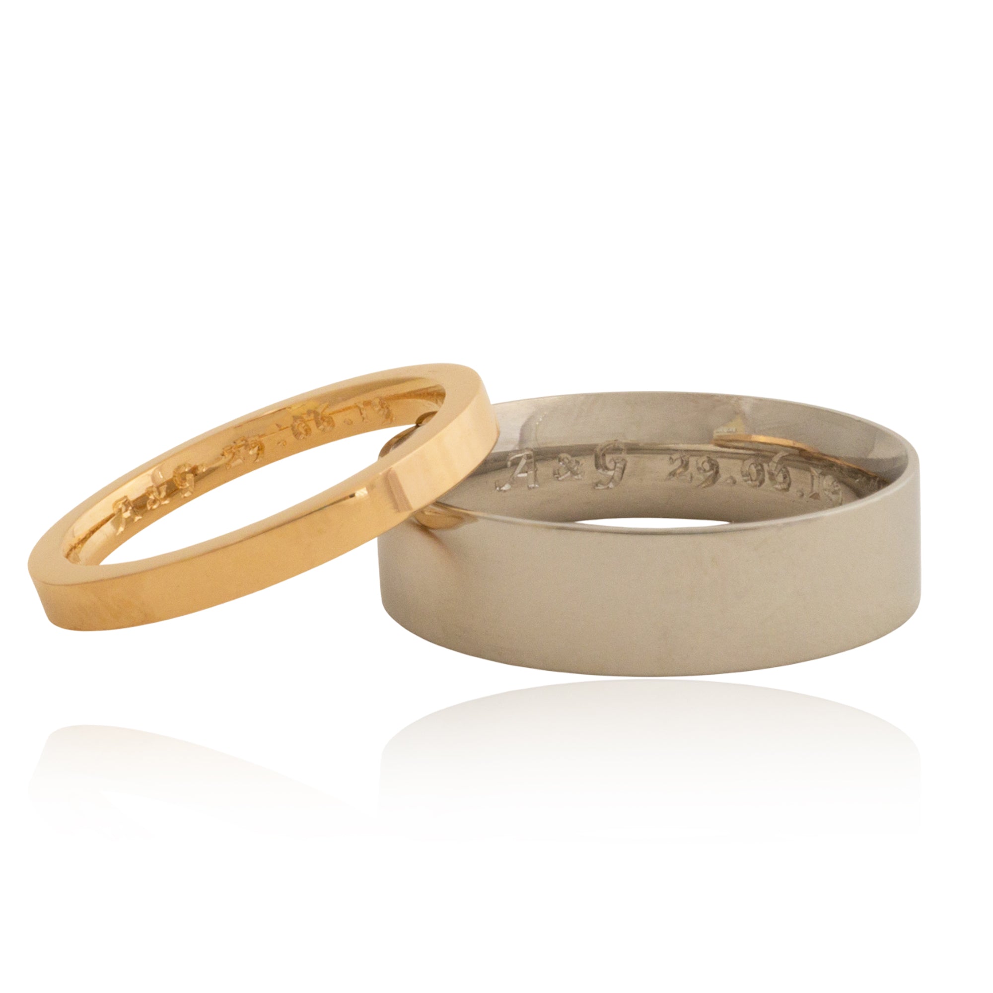 Hand engraved wedding rings. Left: 2mm wide flat court 18 carat rose gold. Right: 5.5mm wide palladium flat court (flat on the top, curved on the inside).