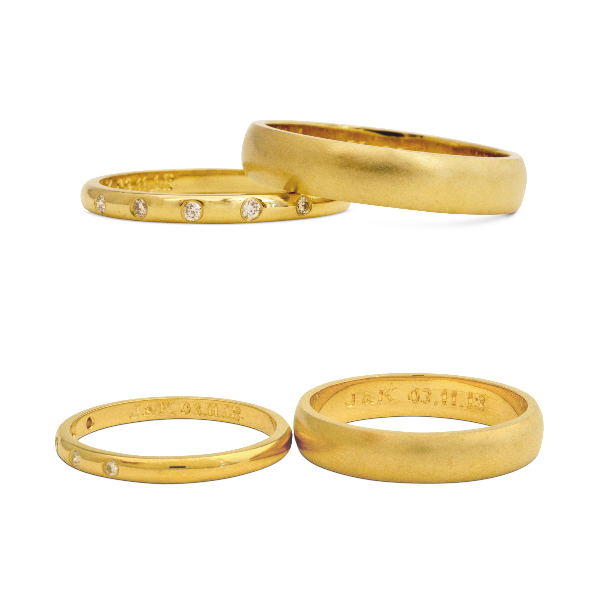 18 carat yellow gold wedding rings. D shaped. Left: 2mm wide with flush set diamonds. Right: 4mm wide, satin finish outer, polished edges and inside. Both rings have the couple's initials and wedding date hand engraved on the inside.