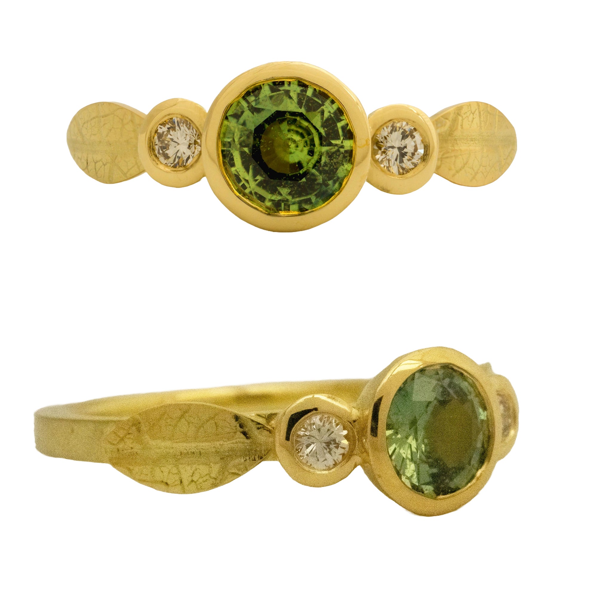Green sapphire and inherited heirloom diamonds set in 18 carat yellow gold, with two leaf skeleton textured leaf shapes.