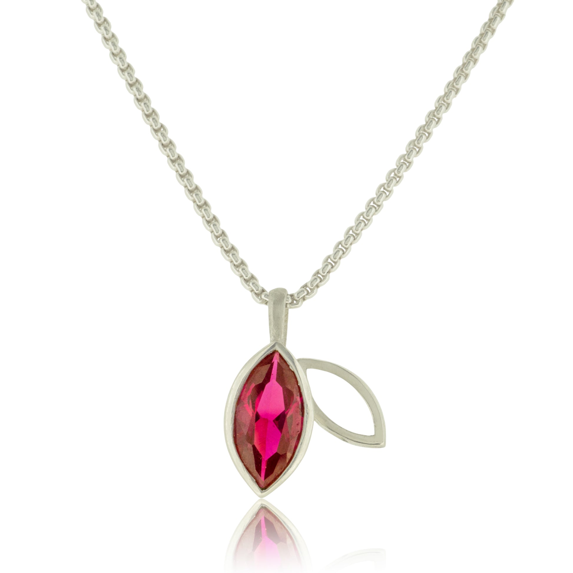 This synthetic ruby and silver pendant brings together rich colour, gentle sparkle and organic detail. The faceted ruby catches the light beautifully, while the open leaf motif to the side adds a natural, sculptural touch.